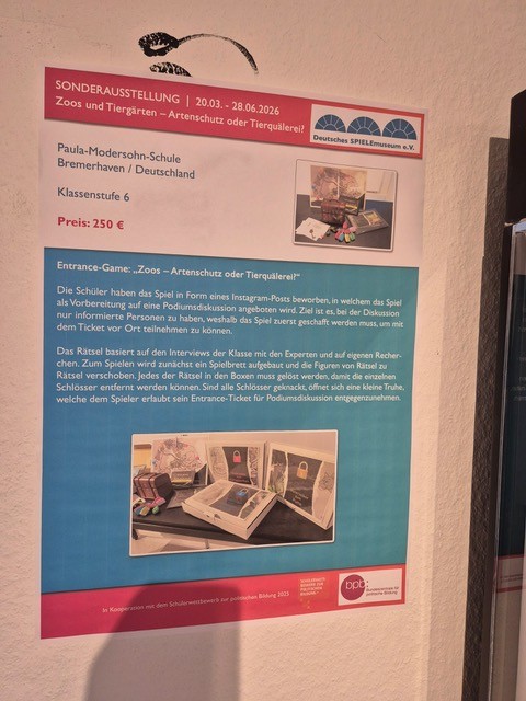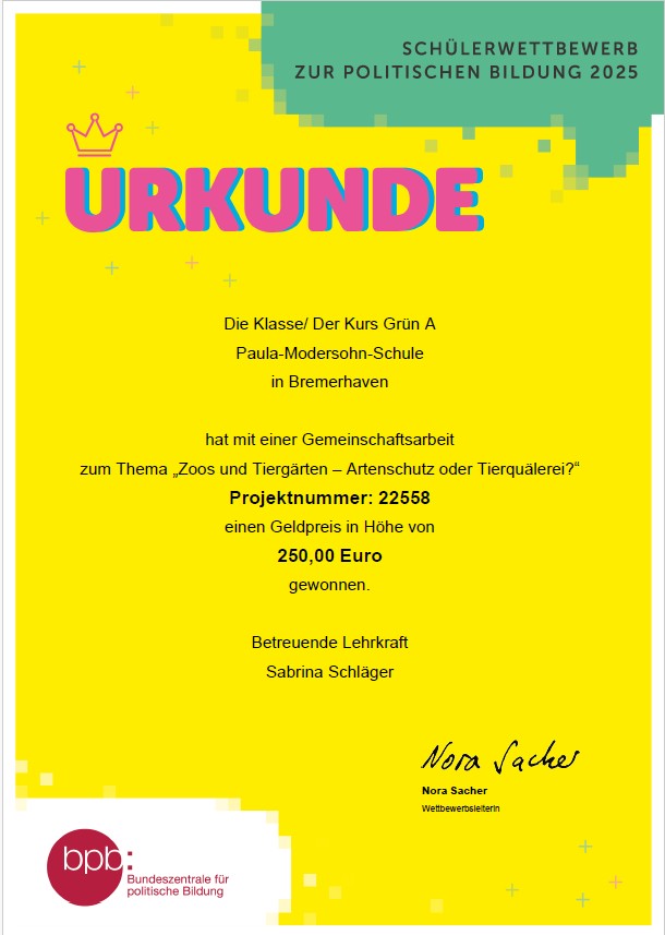 Unser Entrance-Game reichten wir schließlich beim Schülerwettbewerb der Bundeszentrale für politische Bildung ein. Im März erhielten wir dann die tolle Nachricht: Unser Spiel wurde mit einem Preisgeld von 250 Euro ausgezeichnet! Frau Dr. Körner, als Vertreterin der Bundeszentrale, kam extra in unseren Unterricht, überreichte uns die Urkunde und verkündete, dass unser Spiel sogar im Spielemuseum in Chemnitz ausgestellt wird. Wir sind sehr stolz auf diesen Erfolg und freuen uns, wenn viele Schüler*innen unser Spiel nutzen, um sich mit Zoos zu befassen.