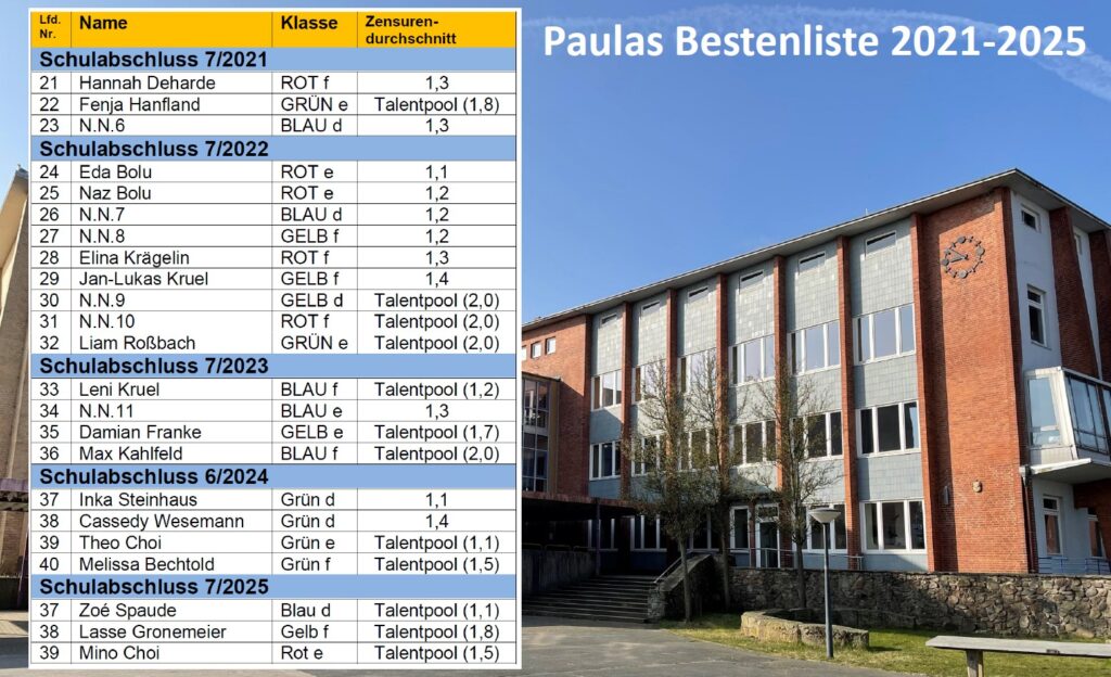 Seit dem Schuljahr 2013/14 führt das Schulleitungsteam der Paula-Modersohn-Schule „Paulas Bestenliste“. Auf sie kommen nur Schülerinnen und Schüler, die kaufmännisch gerundet einen Zensurendurchschnitt von 1 in ihrem Abschlusszeugnis haben, also einen Schnitt von 1,4 oder besser.