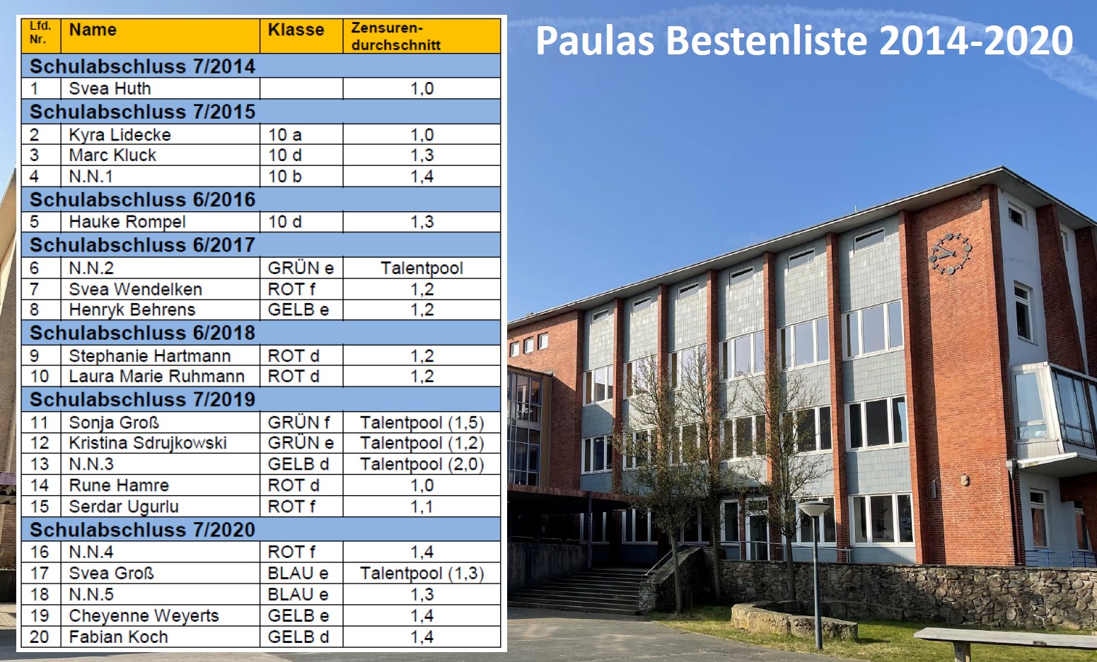 Seit dem Schuljahr 2013/14 führt das Schulleitungsteam der Paula-Modersohn-Schule „Paulas Bestenliste“. Auf sie kommen nur Schülerinnen und Schüler, die kaufmännisch gerundet einen Zensurendurchschnitt von 1 in ihrem Abschlusszeugnis haben, also einen Schnitt von 1,4 oder besser.